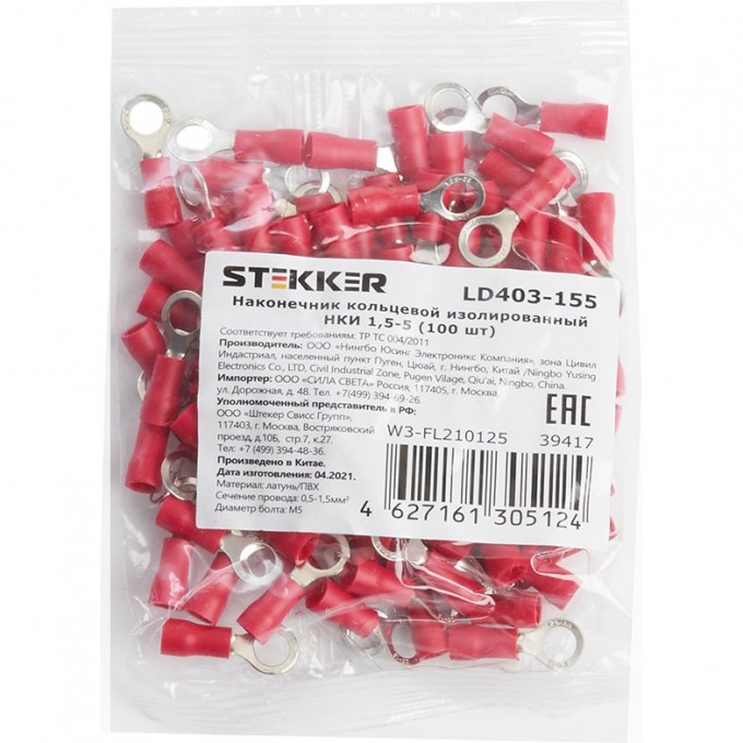 Наконечник Кольцевой Изолированный STEKKER; М5 0,5-1,5 - 0,6 мм; , латунь, поливинилхлорид (PVC), красный